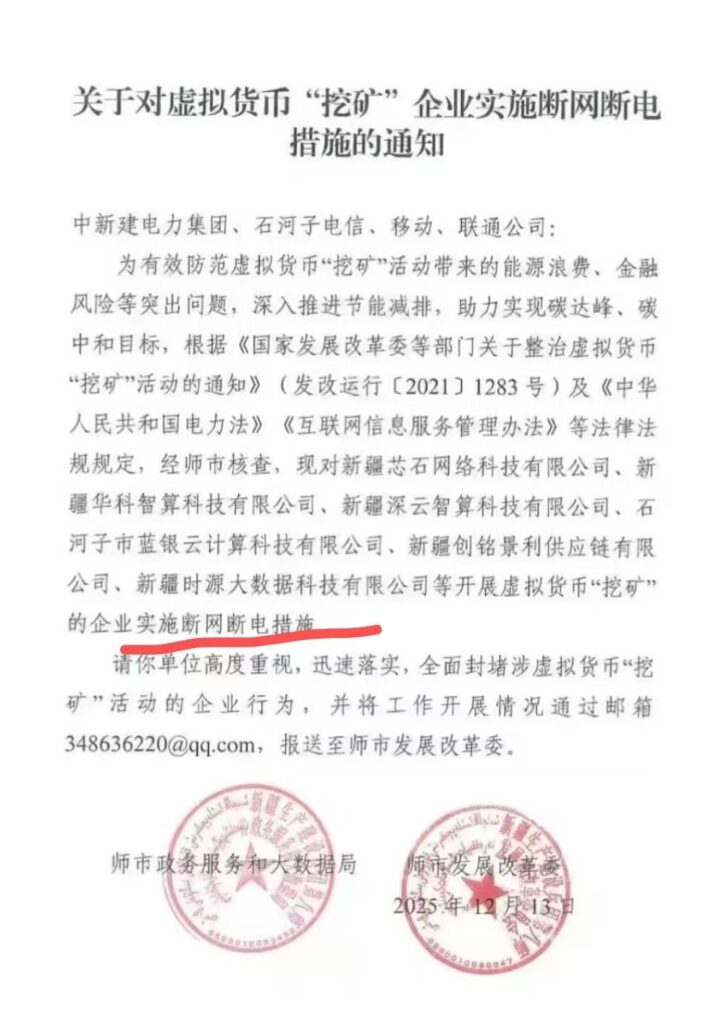 随后流传出了新疆某市对于辖区内的“大数据公司”,实为比特币矿场的进行断网断电处理的公文: