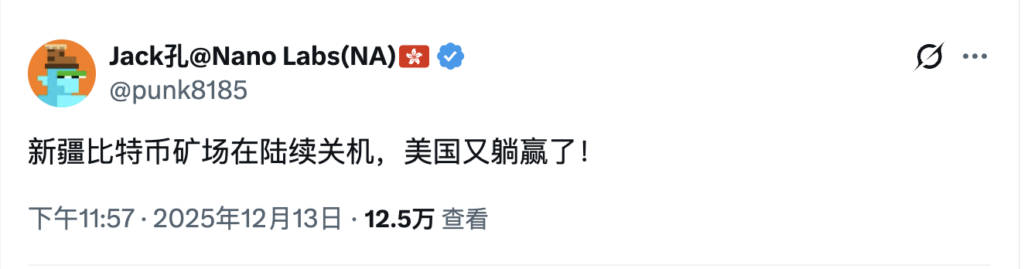 12月13日,嘉楠老总孔剑平发文称新疆的比特币矿场在陆续关机。
