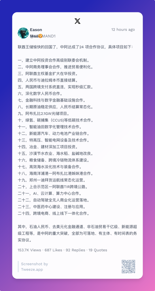 总体判断:此次24项协议务实性强,能源(光储、电池、石油人民币)、电网、农业、物流是落地最快的领域。中国电建、宁德时代、中国石油是最直接关联的A股标的,短期催化明显;其他龙头企业通过产业链延伸或技术输出中长期受益。阿联酋主权基金扩大在华投资(协议3)也将为相关企业带来潜在资本支持。